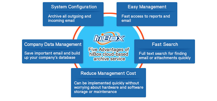 hiBox automatically captures and stores incoming and outgoing messages in the archive. It helps businesses to archive, search and manage important emails, and easily establish a database. |