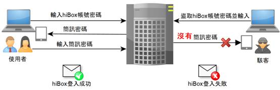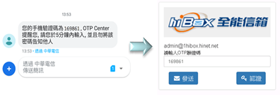 使用郵件簡訊OTP密碼鎖服務,意即hiBox客戶在登入webmail信箱時,除了輸入信箱帳號密碼外,須同時輸入由OTP中心(OTP Center)發送至您手機的簡訊密碼,